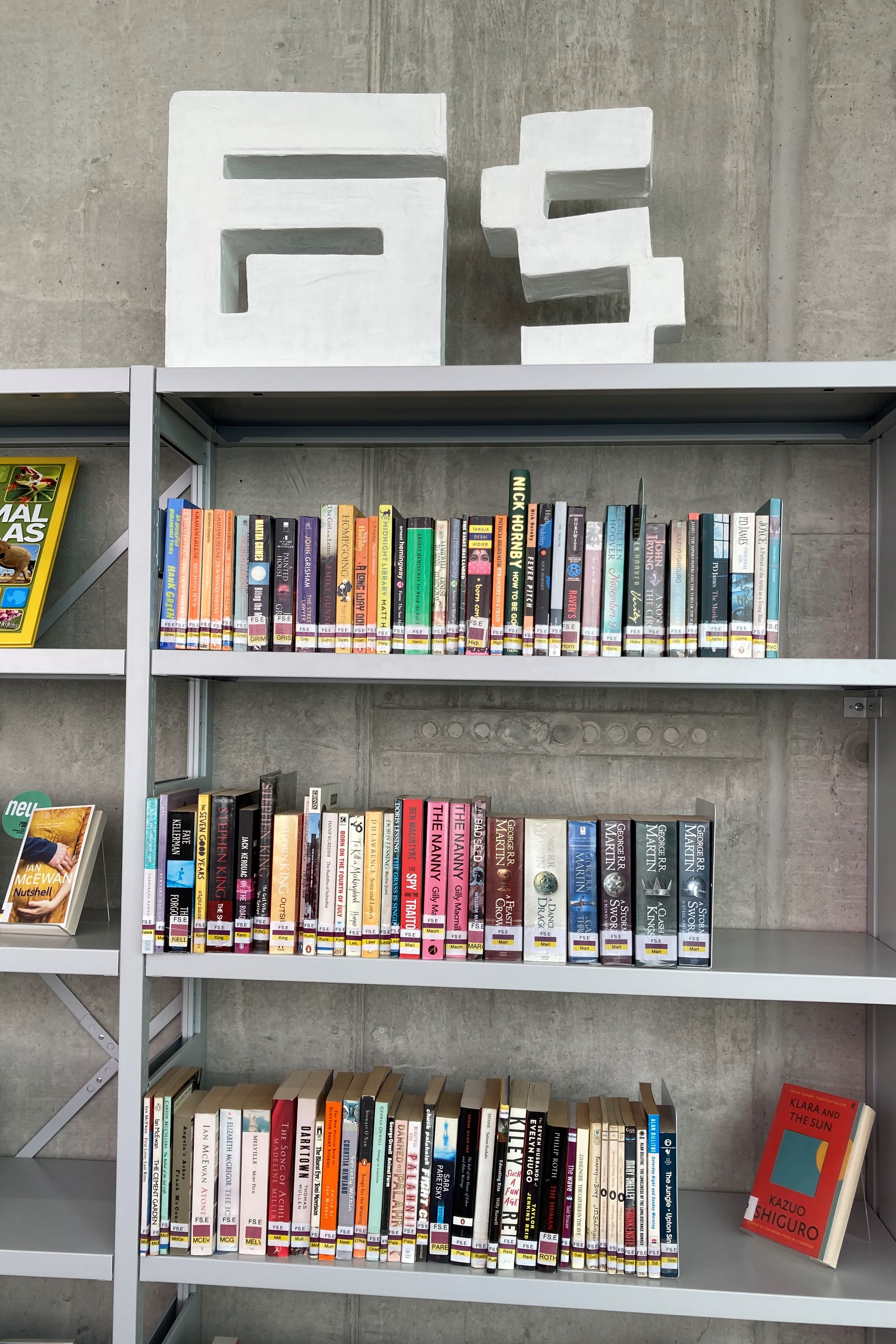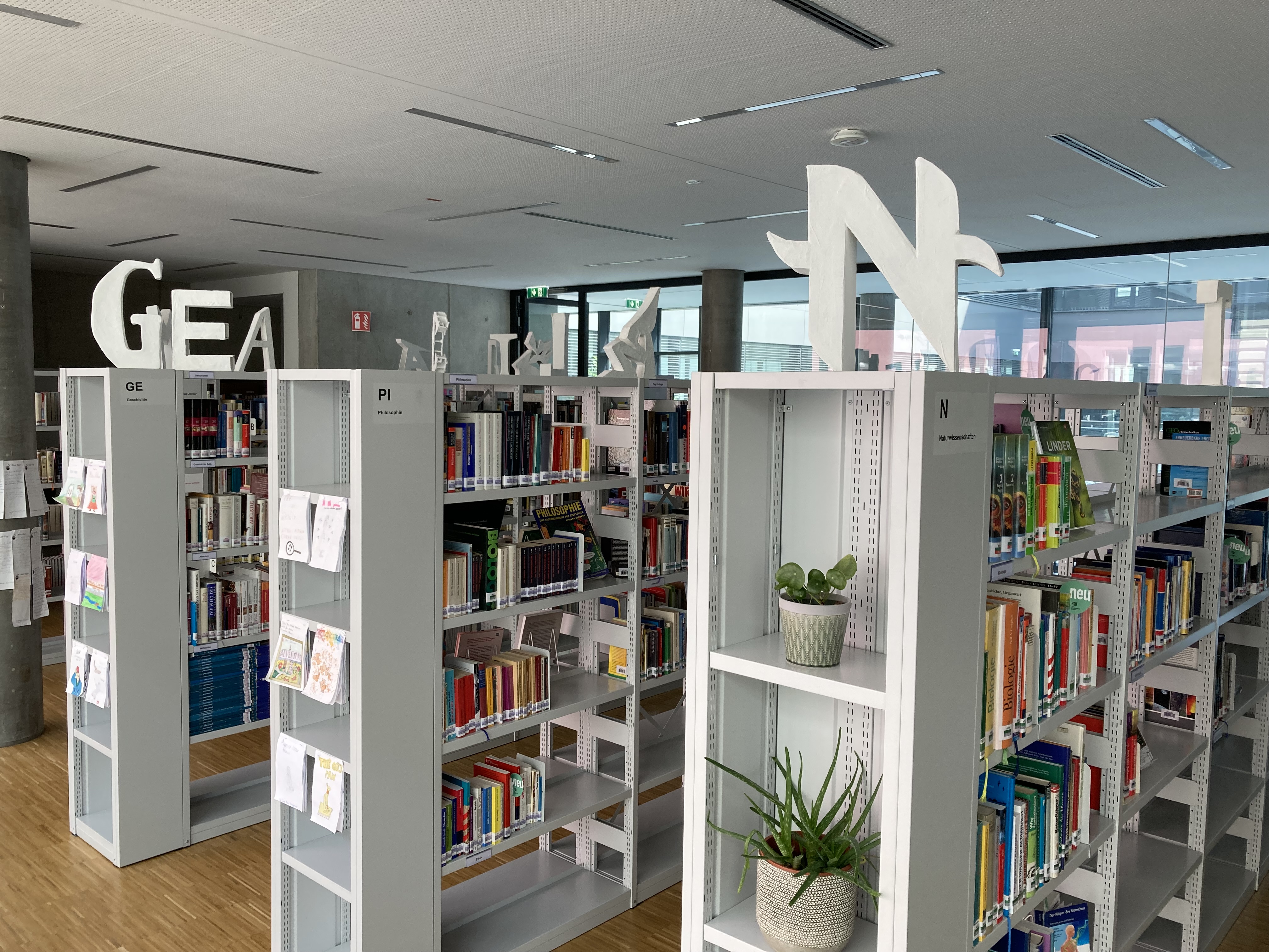 Die 5K hat sich im Unterricht mit dem Thema „Buchstaben“ auseinandergesetzt – die Vielfalt der gestalteten Formen kann jetzt in der Bibliothek bewundert werden.